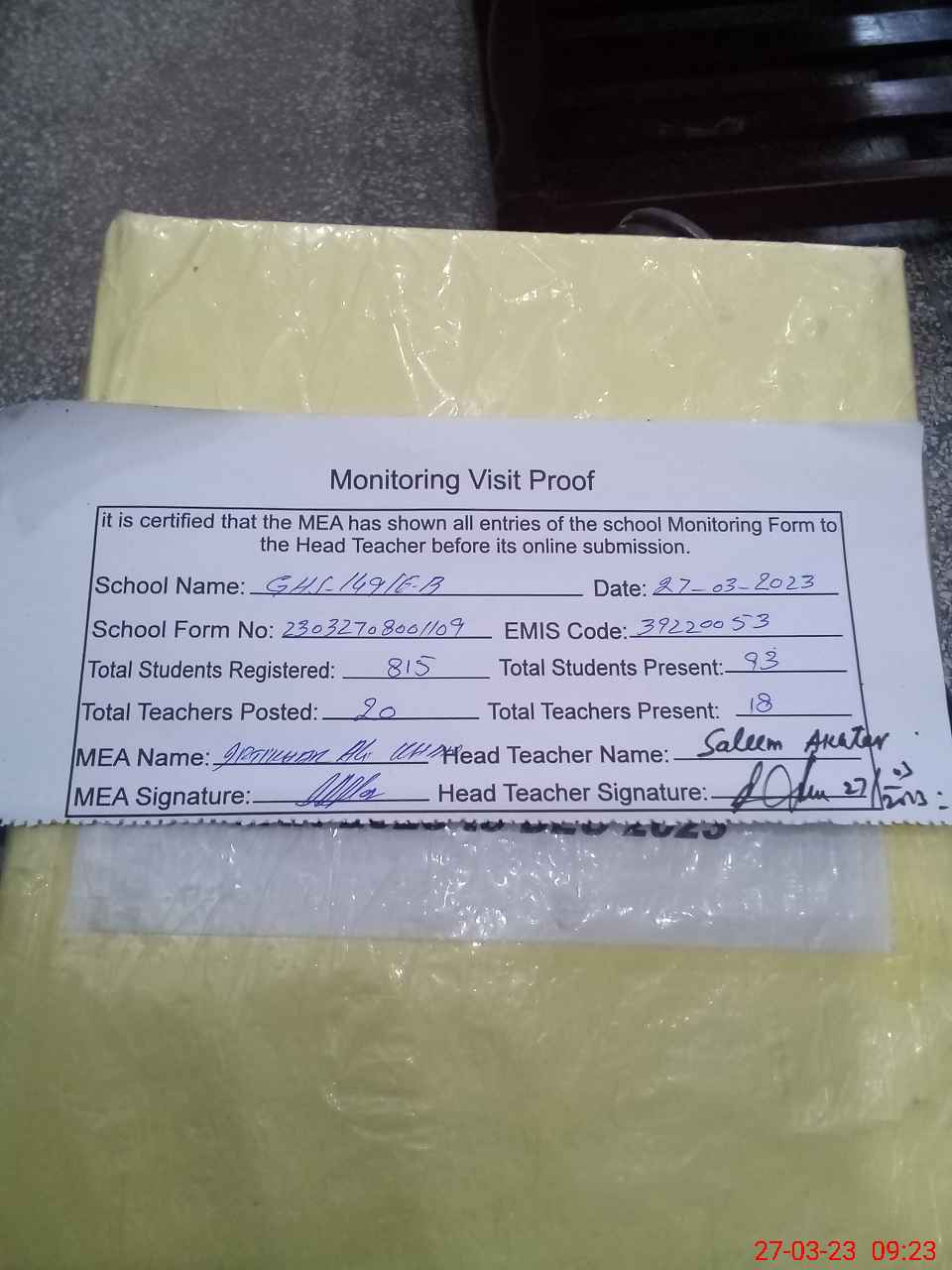 | EMIS Code: 39220053 | Name of School: GHS 149 EB ARIF WALA | |||