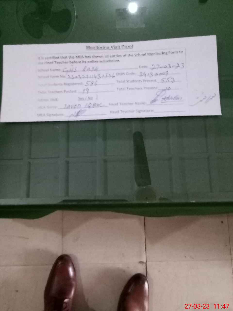 | Attendance Register | Head Teacher | MEA with School | Visit Proof |