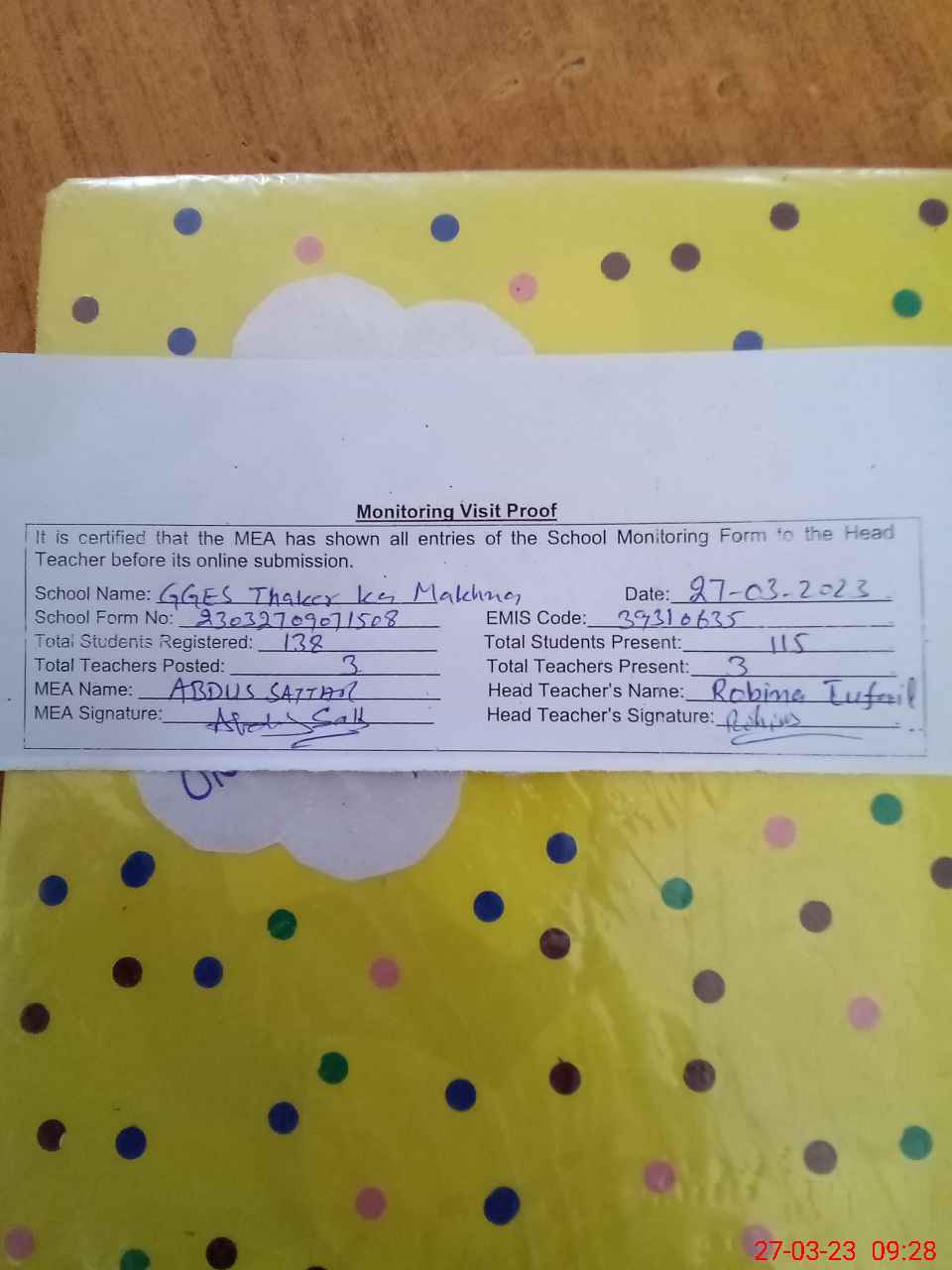 | Attendance Register | Head Teacher | MEA with School | Visit Proof |