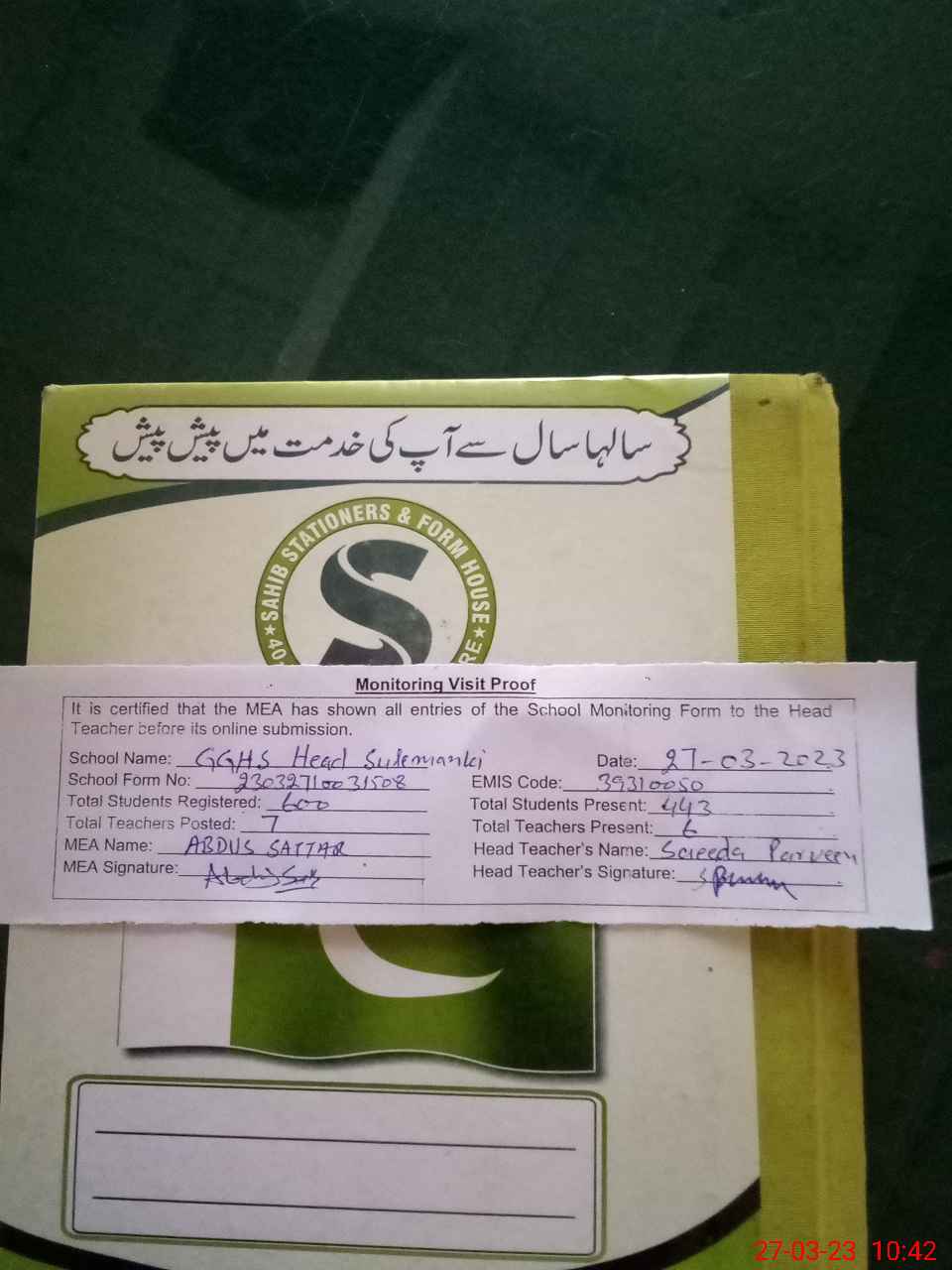| Attendance Register | Head Teacher | MEA with School | Visit Proof |