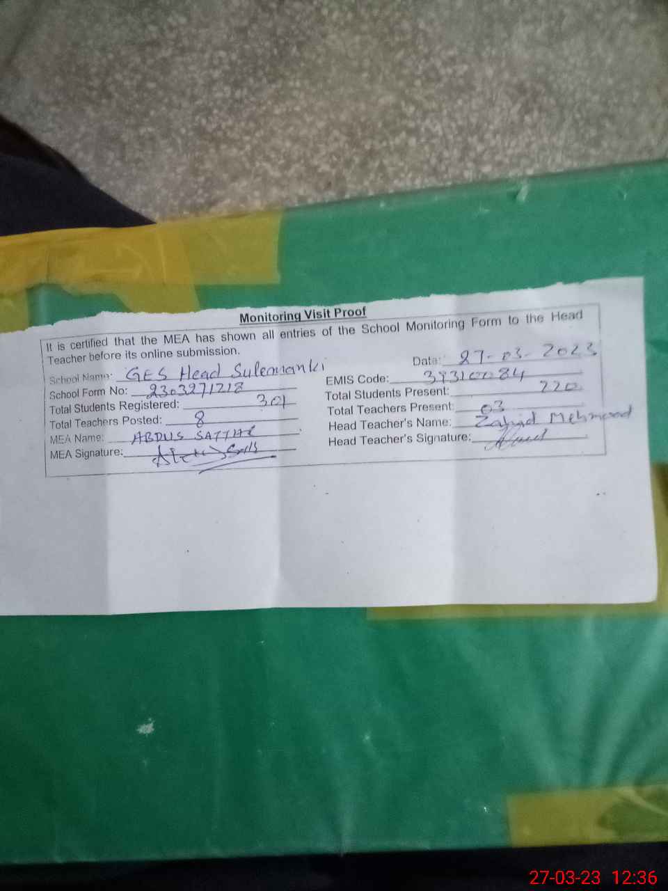 | Attendance Register | Head Teacher | MEA with School | Visit Proof |