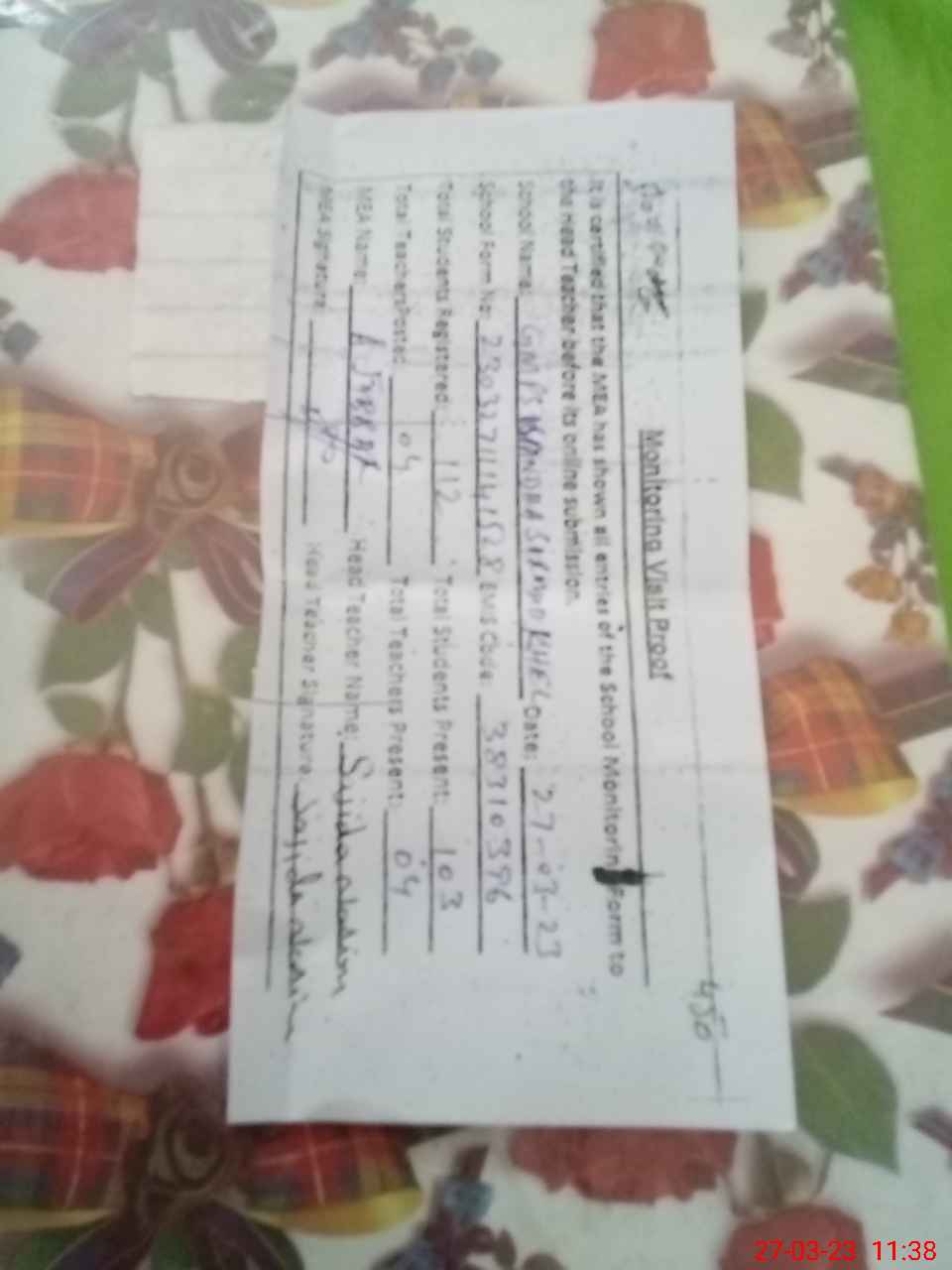 | Attendance Register | Head Teacher | MEA with School | Visit Proof |