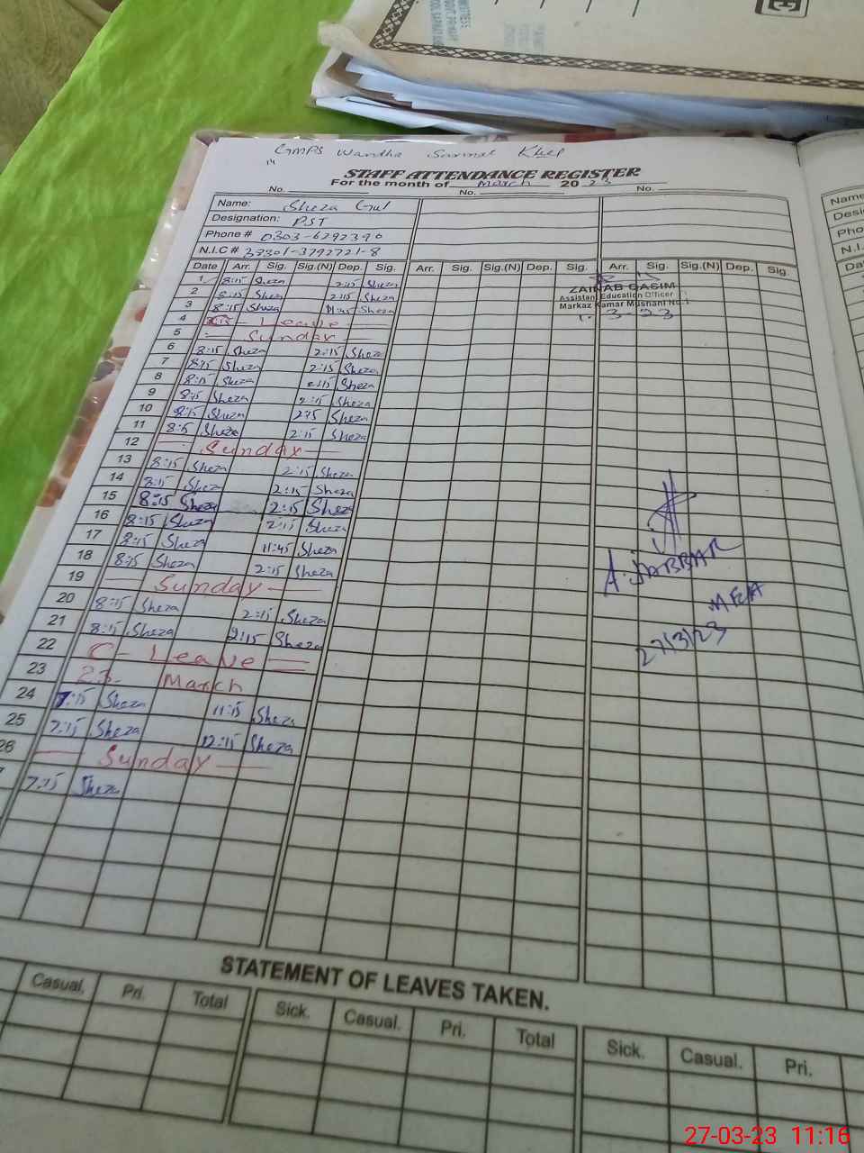 | Name: Sh**** Gu**** Designation: (School Headmaster's/Headmistress's) PST Phone/Cell Number: 03**** |