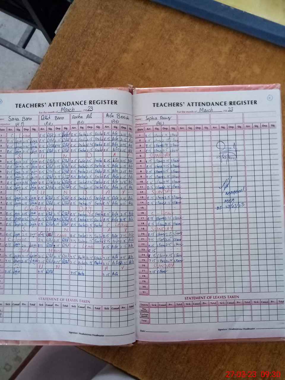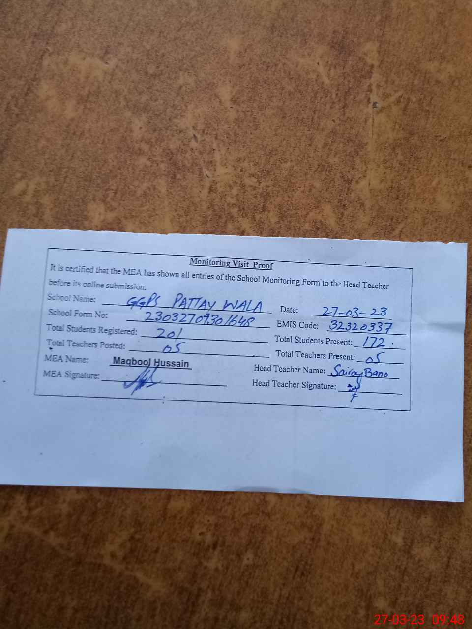 | Attendance Register | Head Teacher | MEA with School | Visit Proof |