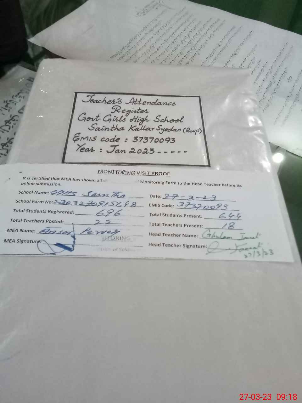 | Attendance Register | Head Teacher | MEA with School | Visit Proof |