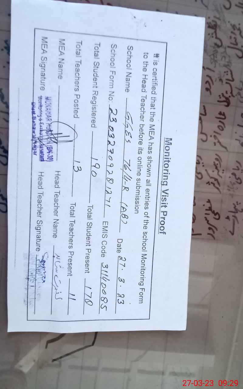 | Attendance Register | Head Teacher | MEA with School | Visit Proof |