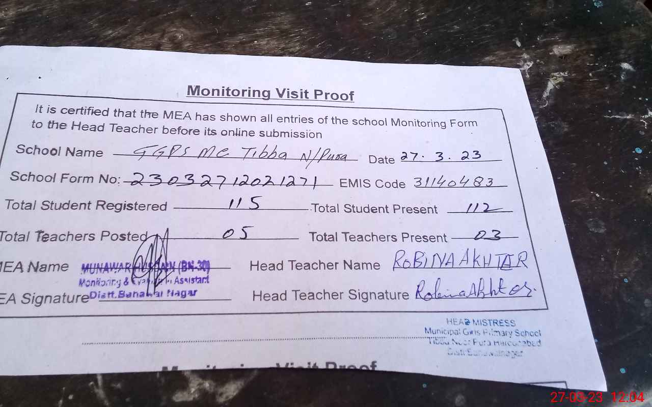 | EMIS Code: 31140483 | Name of School: GGPS MC TIBBA NOOR PURA | |||