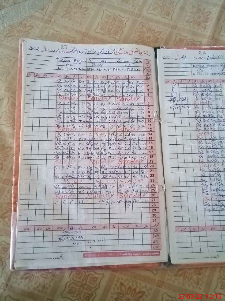 | Total no. of Classrooms: 3 No. of Classrooms Used for Teaching: 3 No. of Classrooms Storing Old Furniture, FTBs, etc: 0Comments if Any: Teacher Tajron Begum were absent present teacher Hajj Bibi fail to show leave record sis |