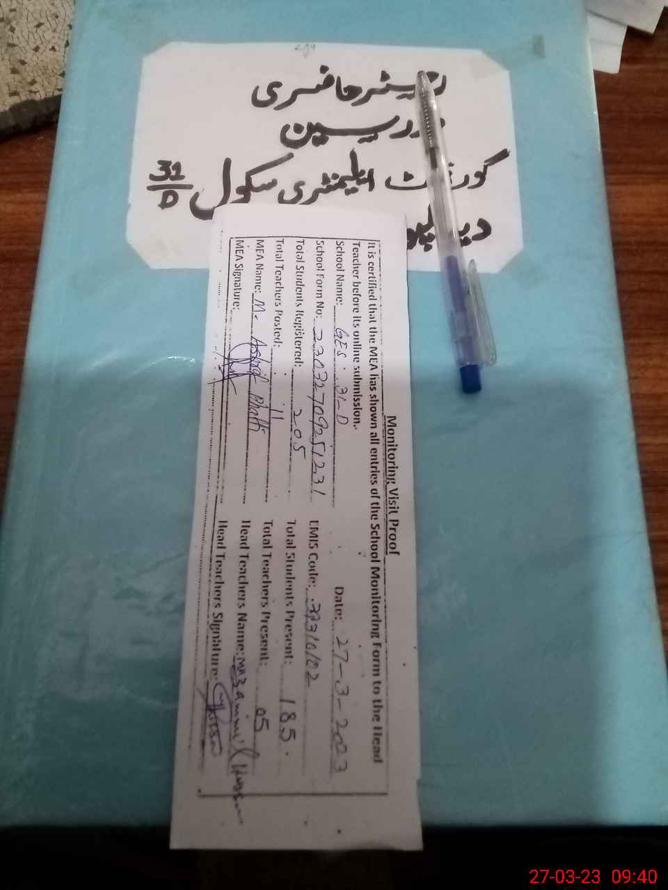 | Attendance Register | Head Teacher | MEA with School | Visit Proof |