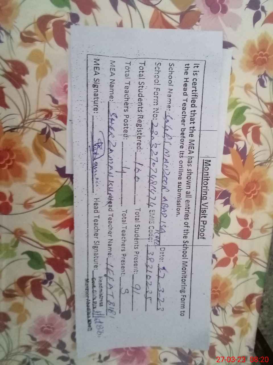 | Attendance Register | Head Teacher | MEA with School | Visit Proof |