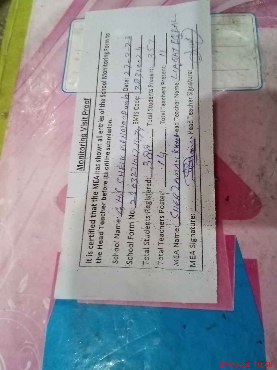 | Attendance Register | Head Teacher | MEA with School | Visit Proof |