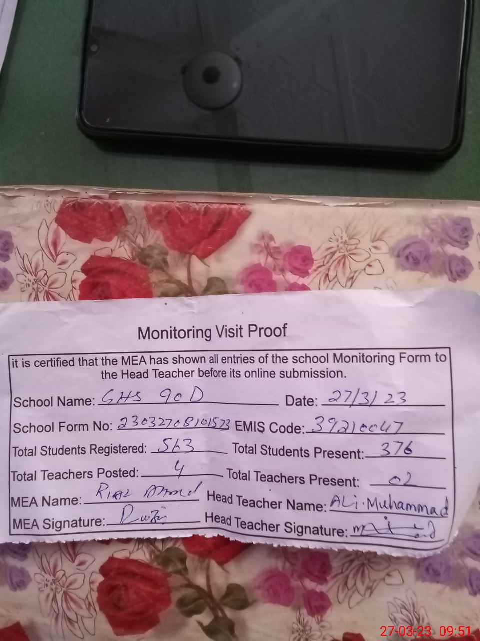 | Attendance Register | Head Teacher | MEA with School | Visit Proof |