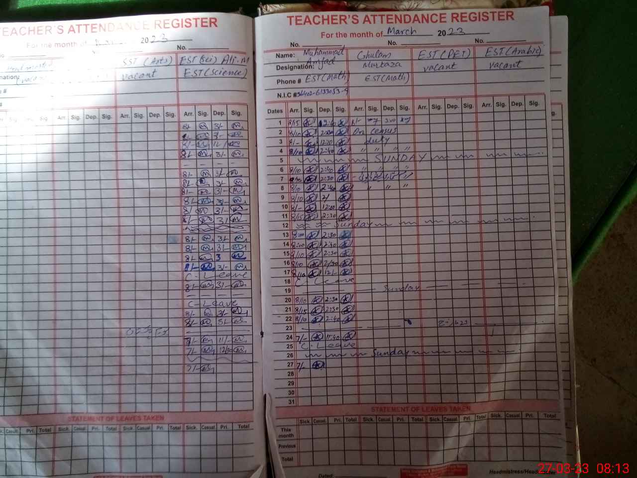 | CNIC | Full Name | Designation | R/C | Absence During Last Calender Month |