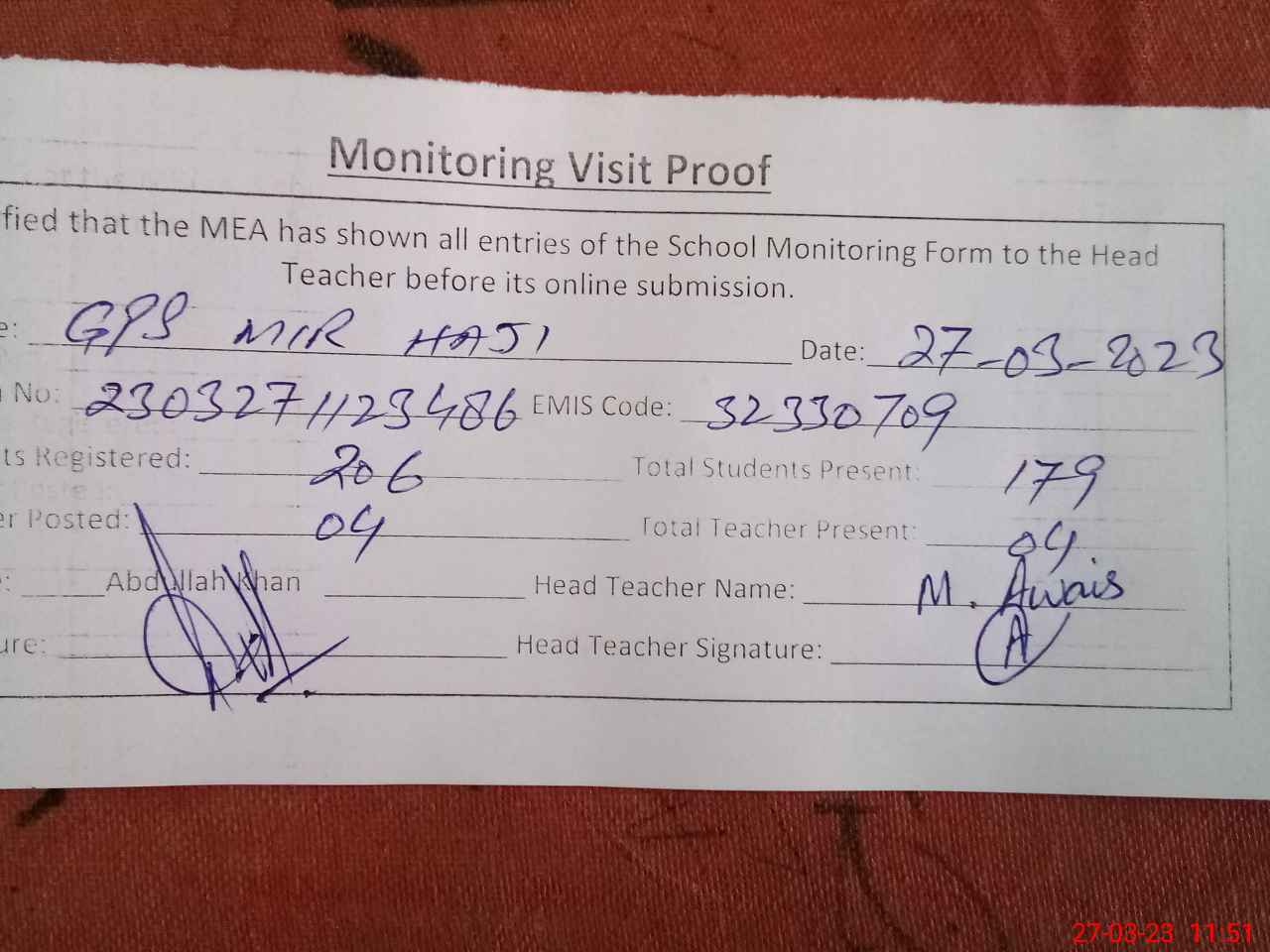 | Attendance Register | Head Teacher | MEA with School | Visit Proof |