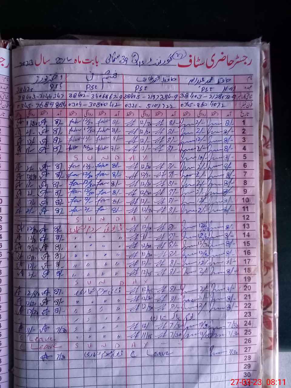 | CNIC | Full Name | Designation | R/C | Absence During Last Calender Month |