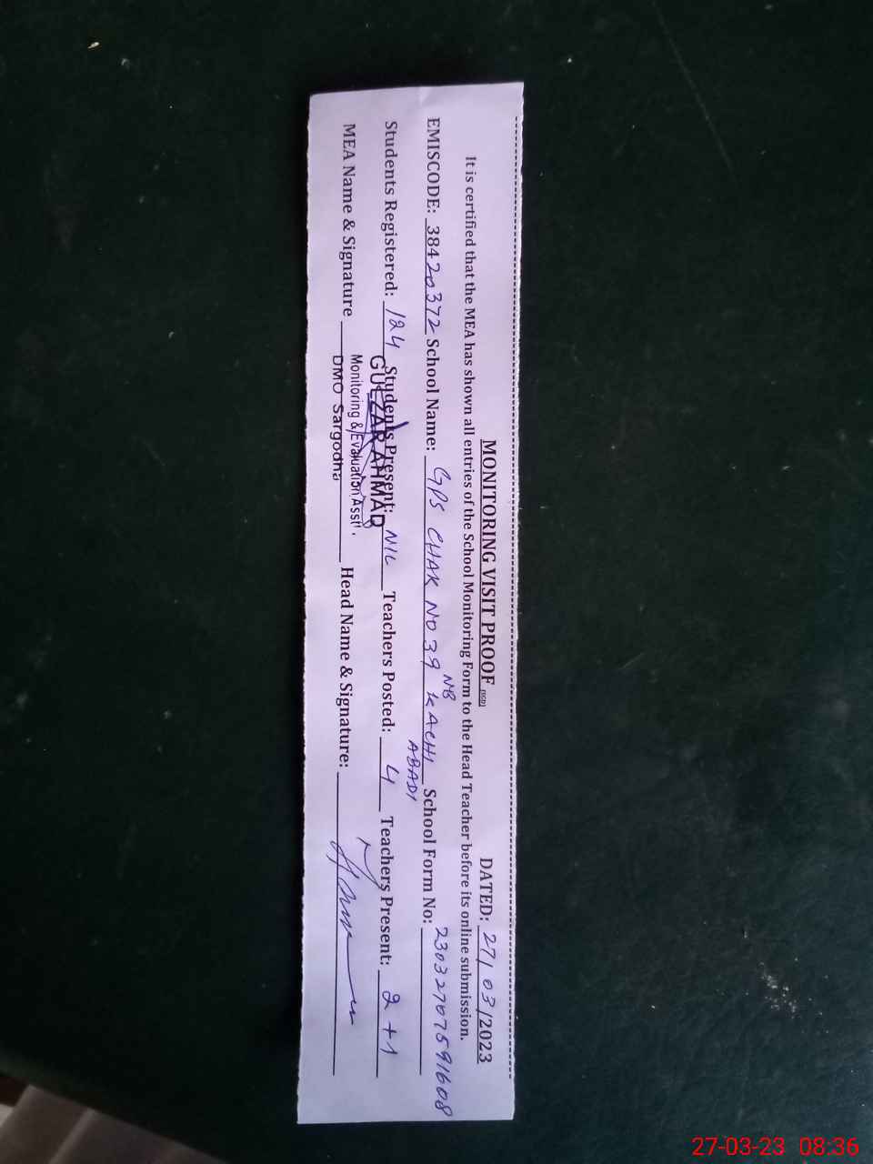 | Attendance Register | Head Teacher | MEA with School | Visit Proof |