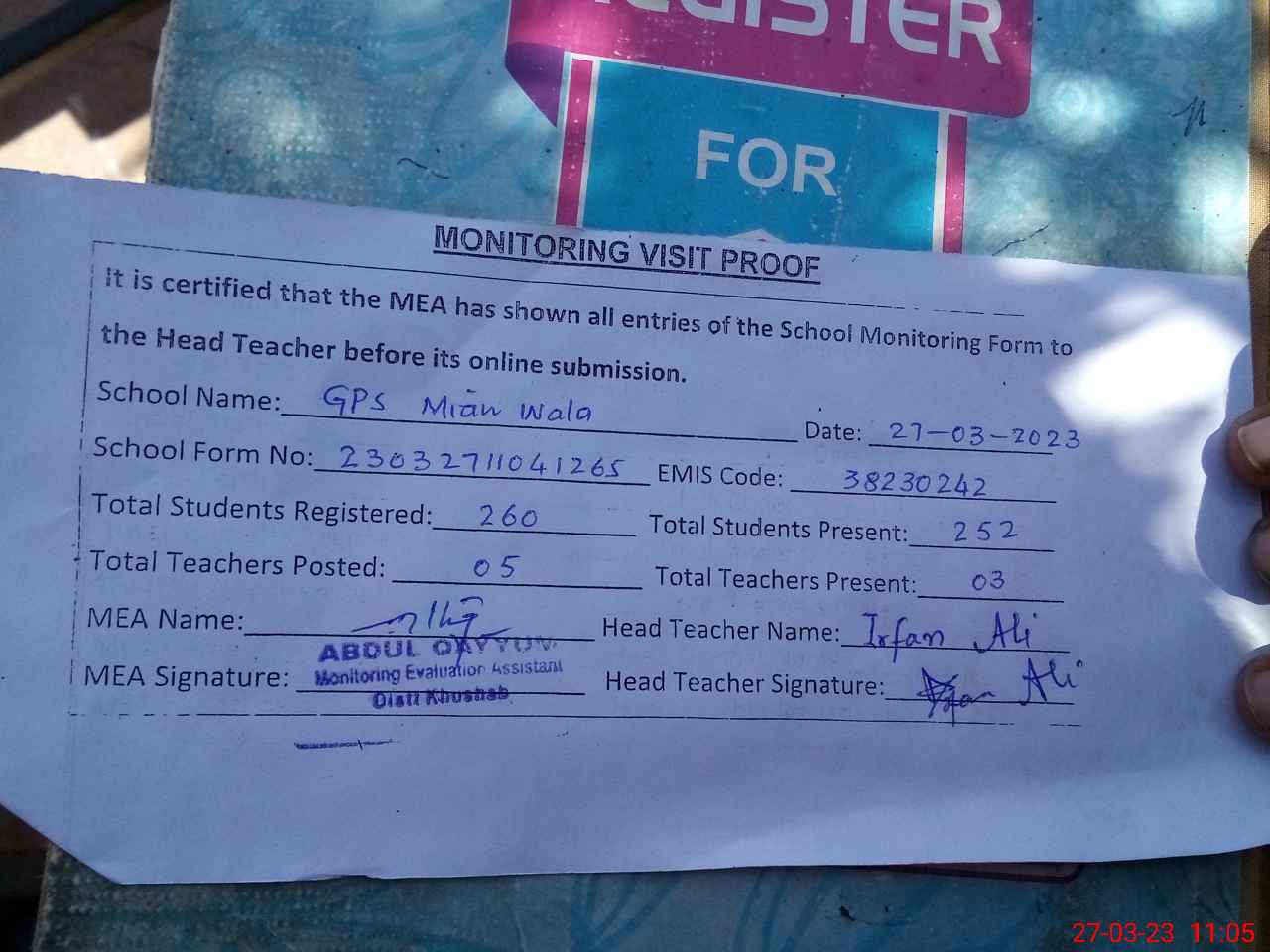 | EMIS Code: 38230242 | Name of School: GPS MIAN WALA | |||
