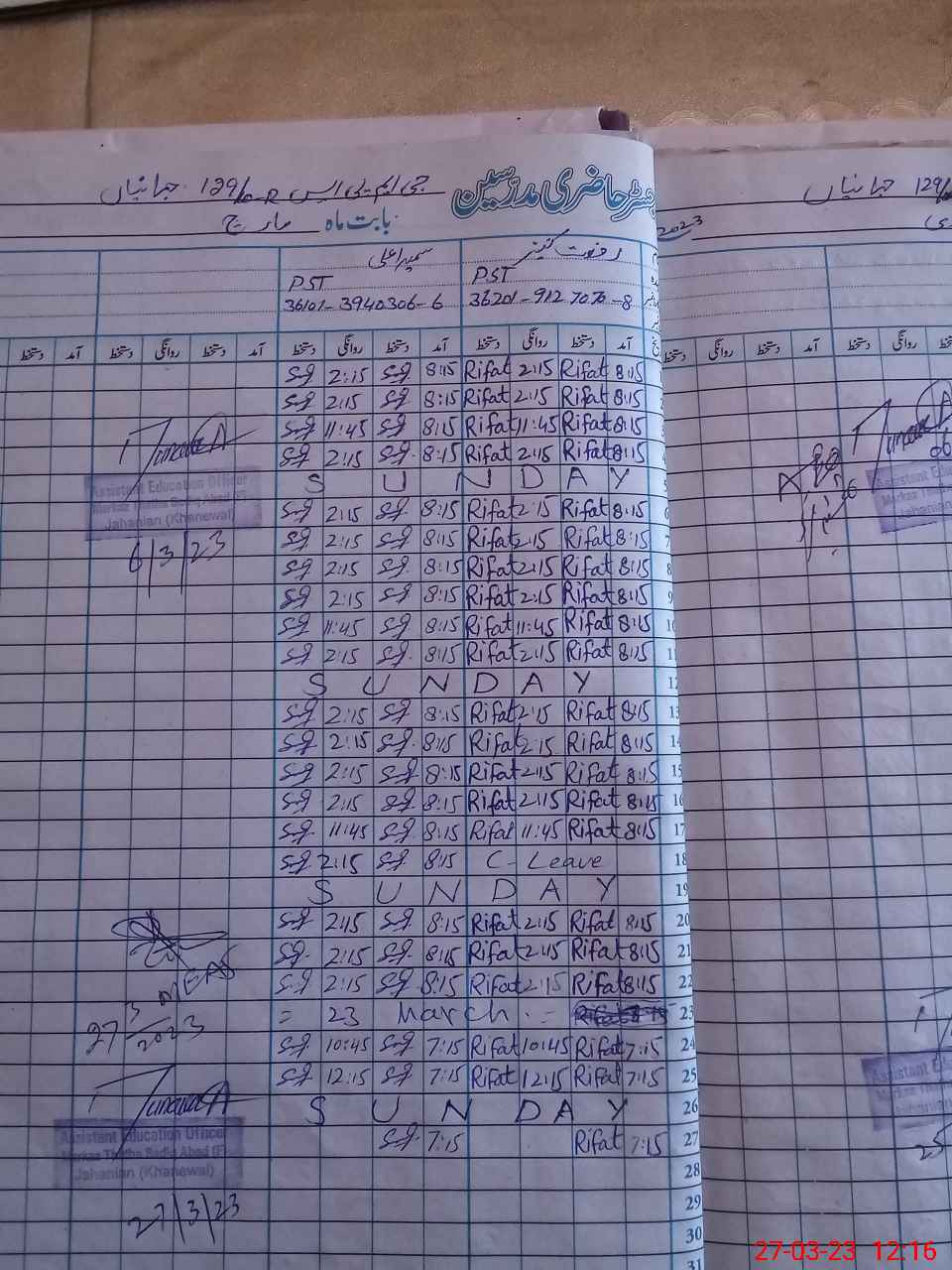 | CNIC | Full Name | Designation | R/C | Absence During Last Calender Month |