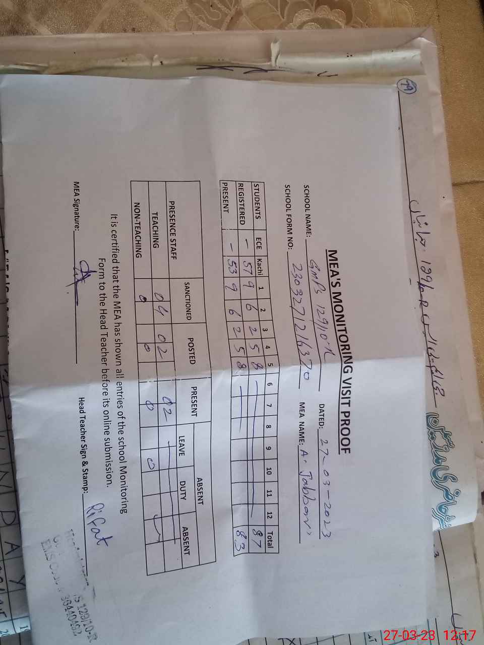 | Attendance Register | Head Teacher | MEA with School | Visit Proof |