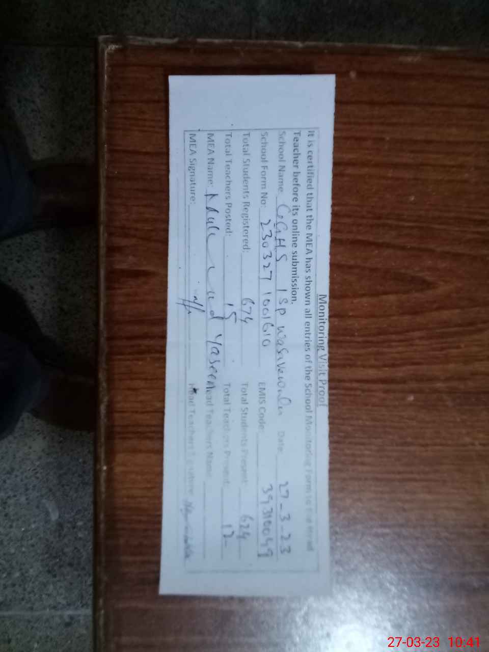 | Attendance Register | Head Teacher | MEA with School | Visit Proof |
