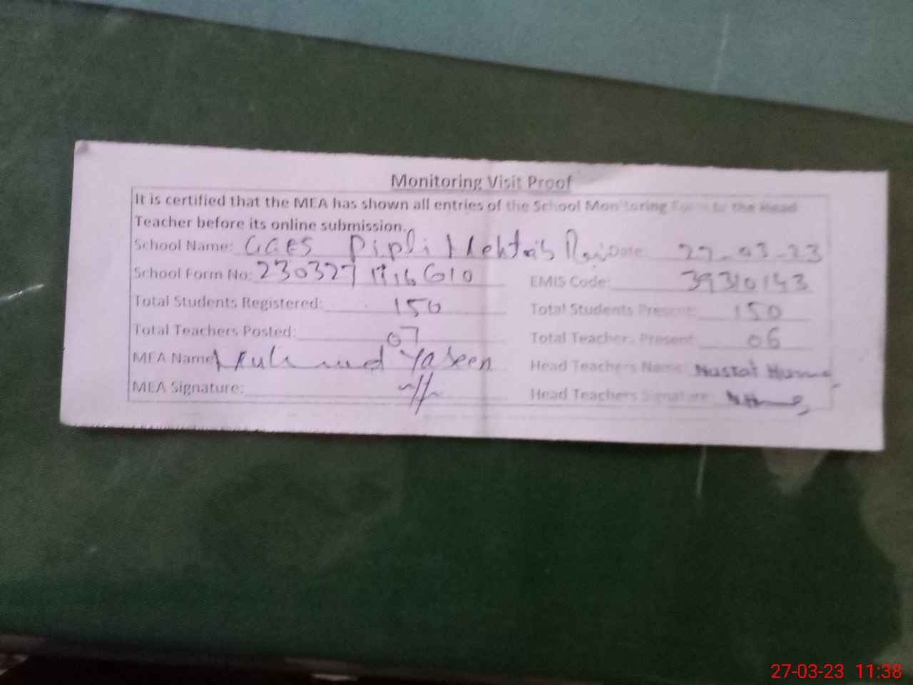 | Attendance Register | Head Teacher | MEA with School | Visit Proof |