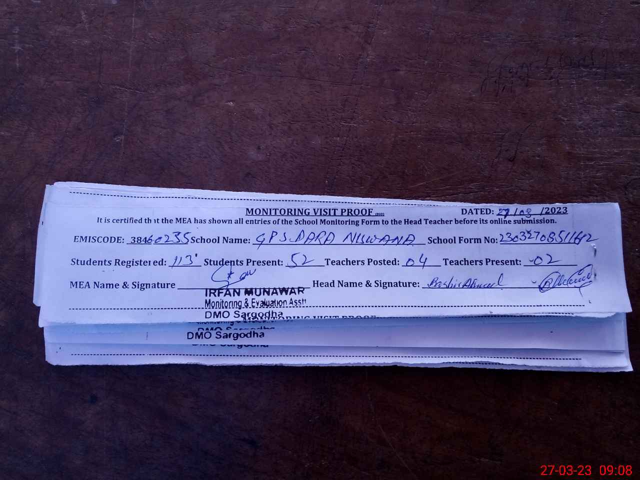 | Attendance Register | Head Teacher | MEA with School | Visit Proof |