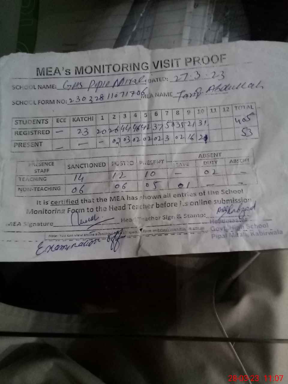 | Attendance Register | Head Teacher | MEA with School | Visit Proof |