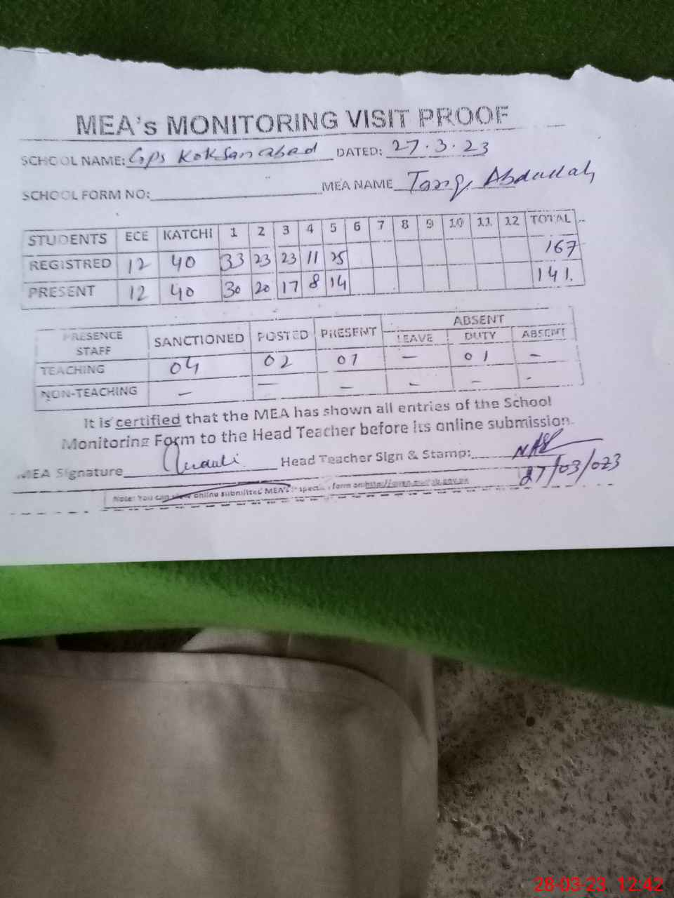 | Attendance Register | Head Teacher | MEA with School | Visit Proof |