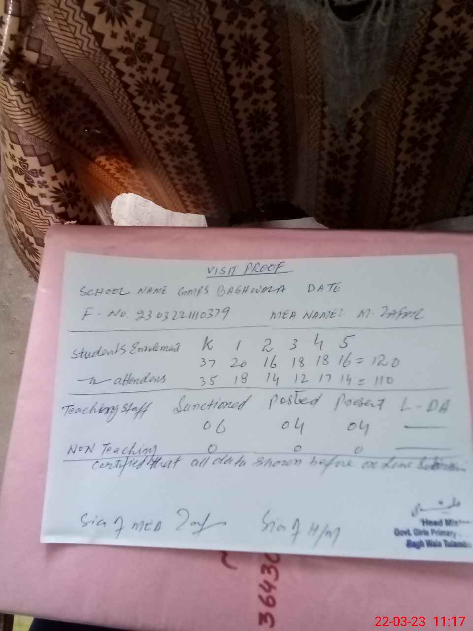 | EMIS Code: 36430368 | Name of School: GMPS BAGH WALA, TULAMBA | |||