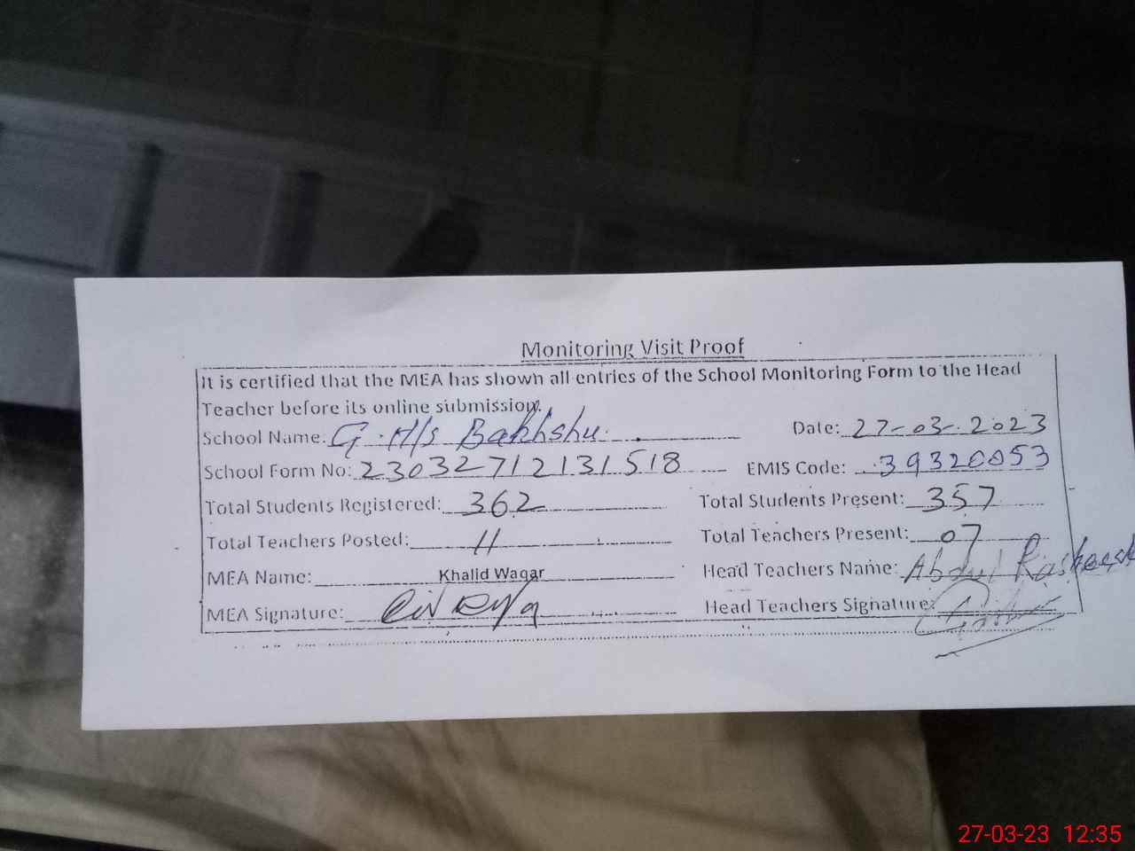 | Attendance Register | Head Teacher | MEA with School | Visit Proof |