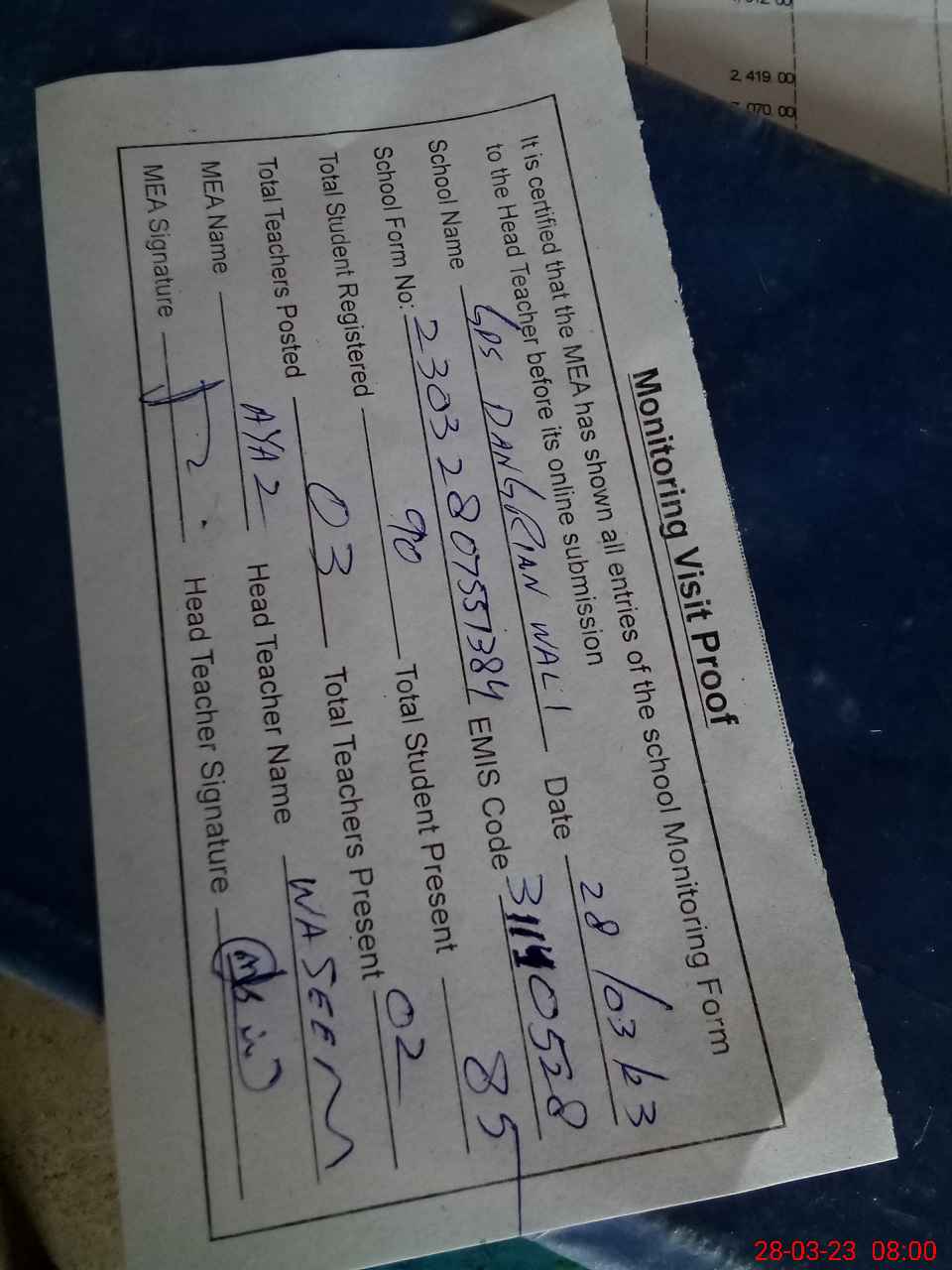 | Attendance Register | Head Teacher | MEA with School | Visit Proof |