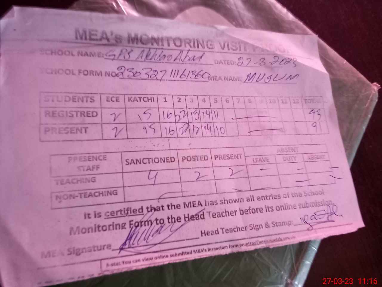 | Attendance Register | Head Teacher | MEA with School | Visit Proof |