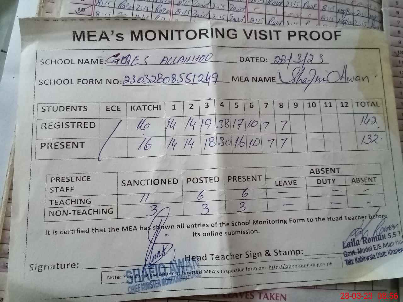 | Attendance Register | Head Teacher | MEA with School | Visit Proof |