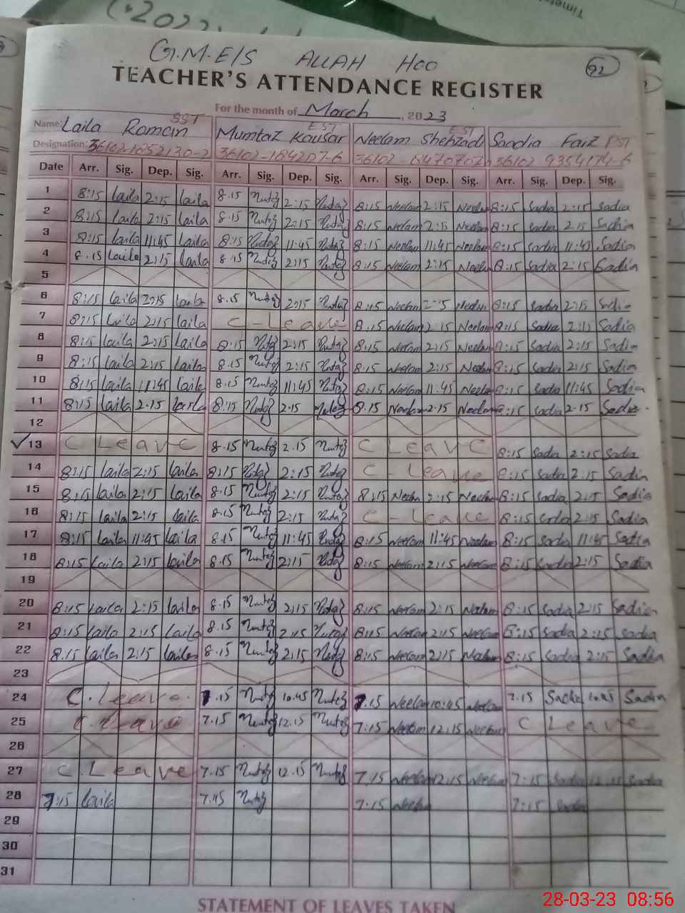| Leave | Duty | Absent | Maternity | Medical | Ex- Pak |