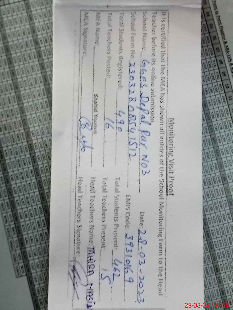 | Attendance Register | Head Teacher | MEA with School | Visit Proof |