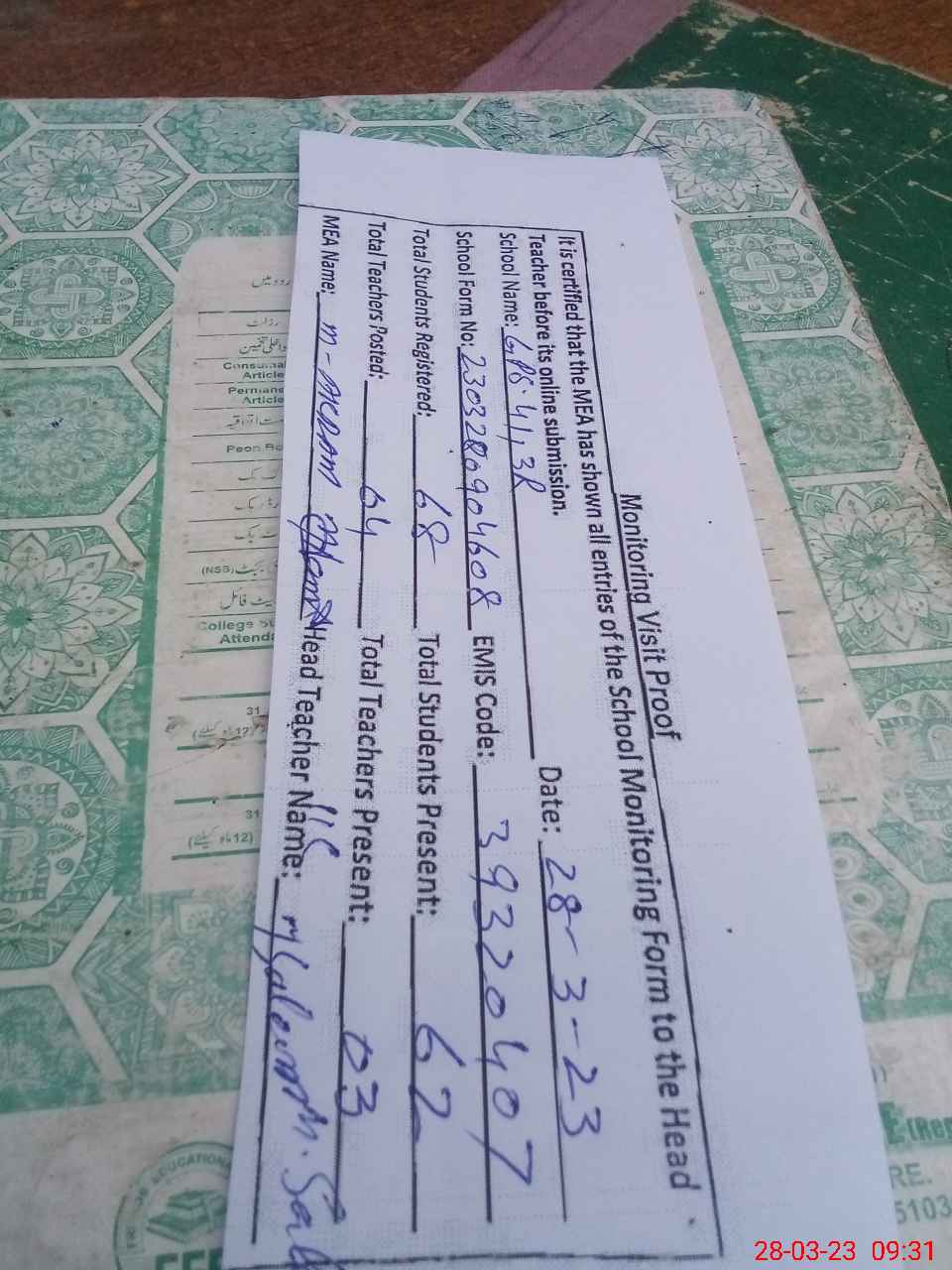 | Attendance Register | Head Teacher | MEA with School | Visit Proof |
