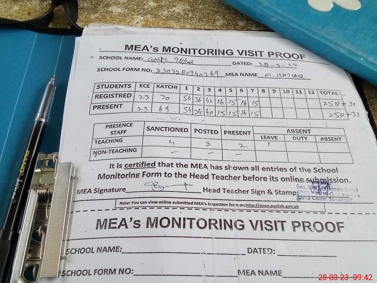 | Attendance Register | Head Teacher | MEA with School | Visit Proof |