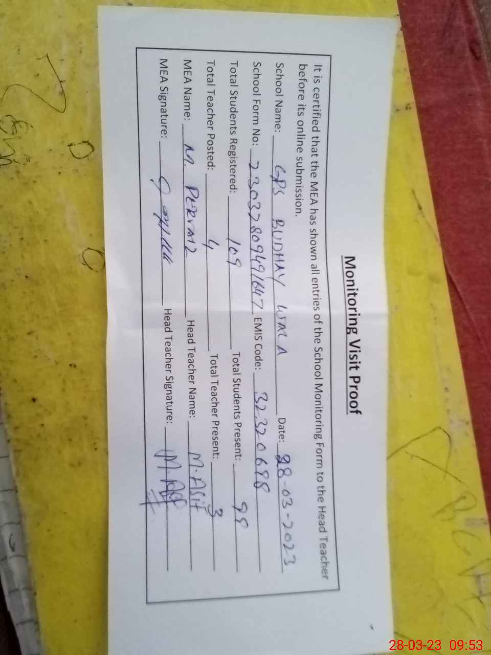 | EMIS Code: 32320698 | Name of School: GPS BUDHAY WALA | |||