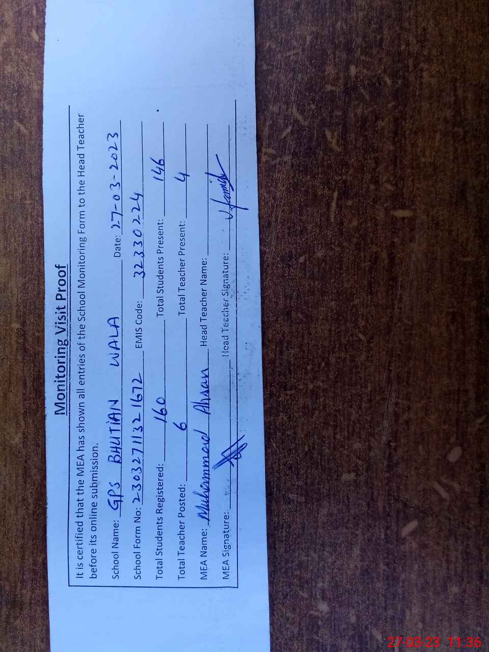| Attendance Register | Head Teacher | MEA with School | Visit Proof |