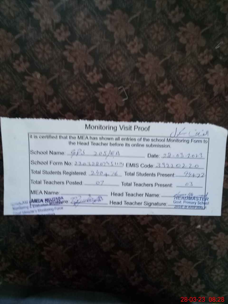 | Monitoring Date: 28-03-2023 | Start Time: 28-03-2023 07:45 AM | End Time: 28-03-2023 08:29 AM | Name of MEA: Gh**** Mu**** Mu**** (R**** | |