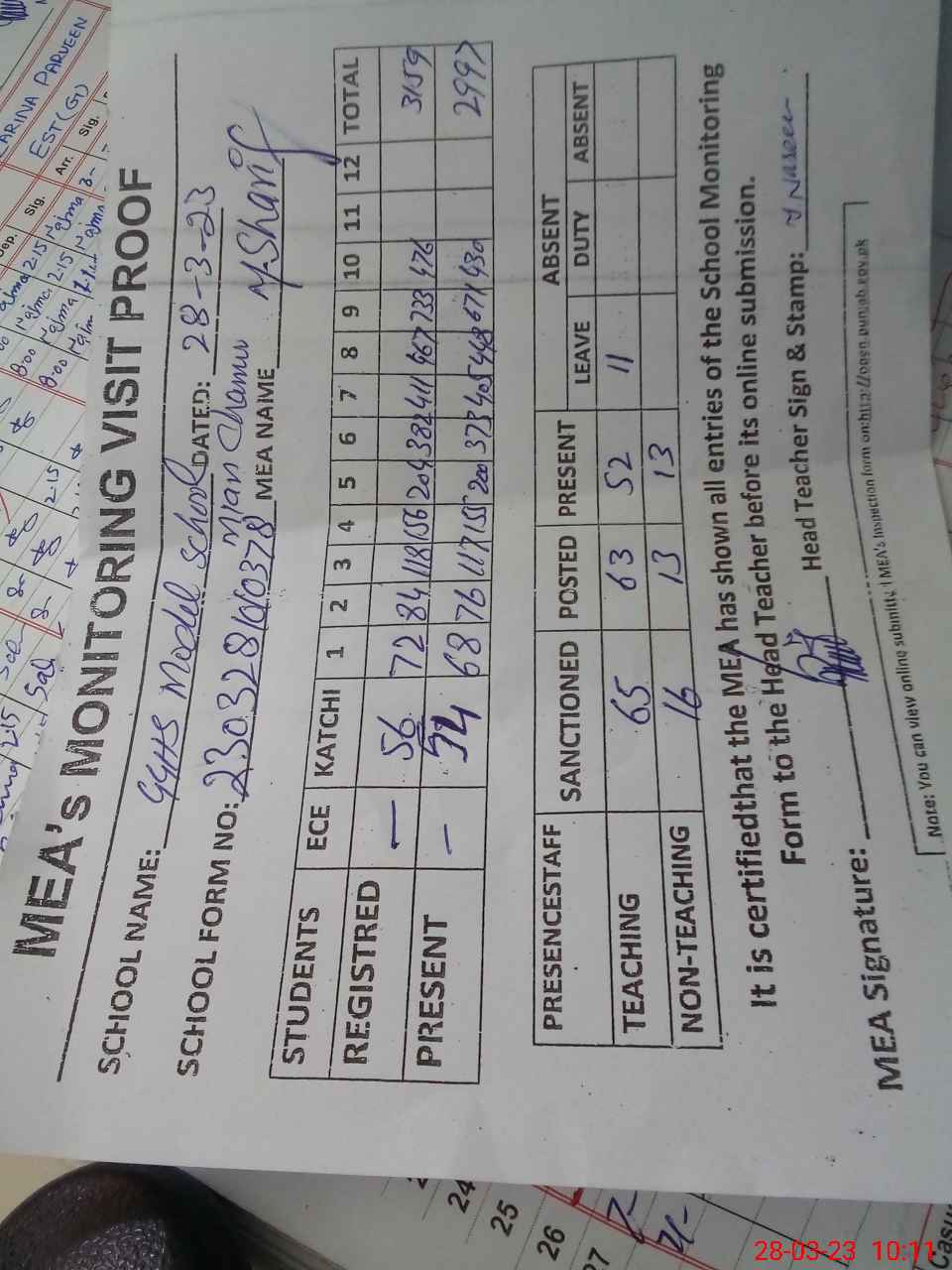 | Attendance Register | Head Teacher | MEA with School | Visit Proof |