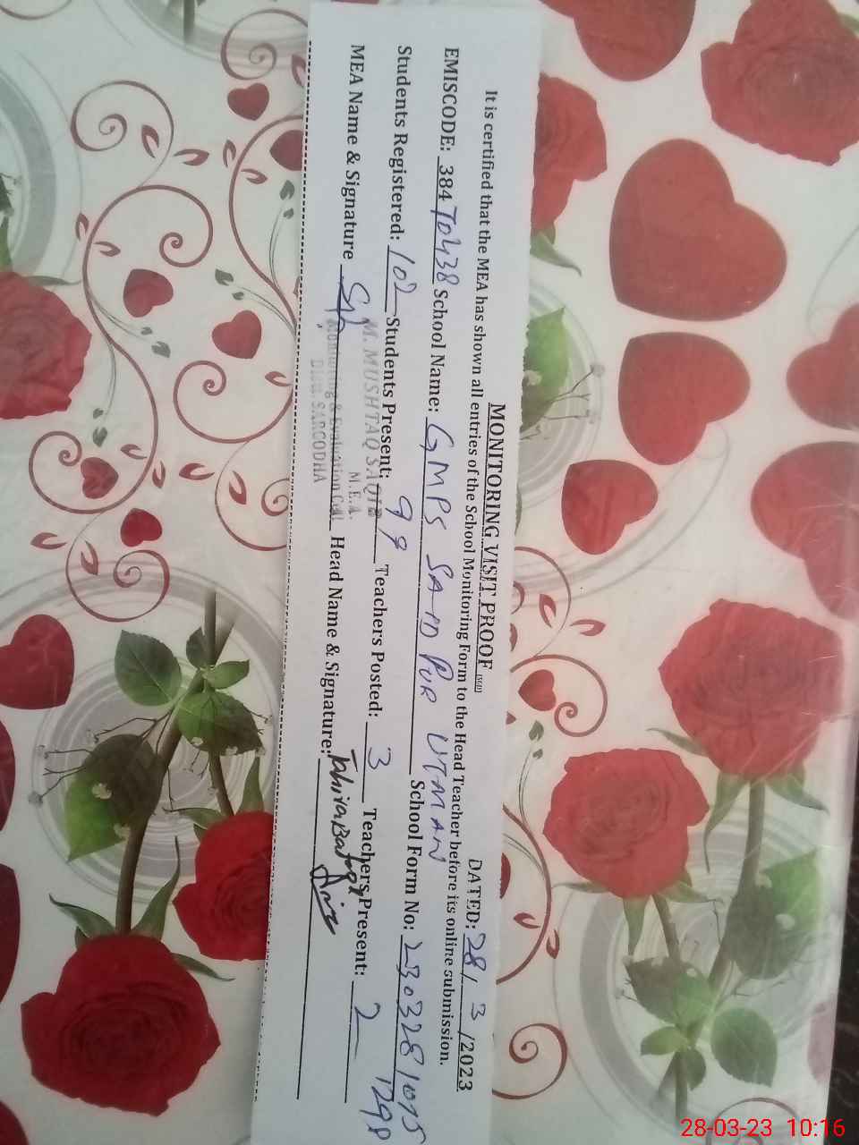 | Certified that this School was Inspected by the Undersigned MEA/DMO Today and the Information Stated Above is as Per Record. | |||||