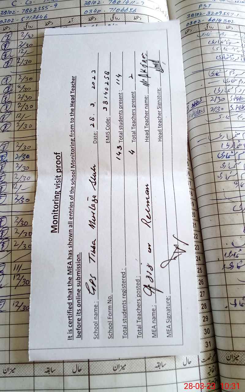 | Attendance Register | Head Teacher | MEA with School | Visit Proof |