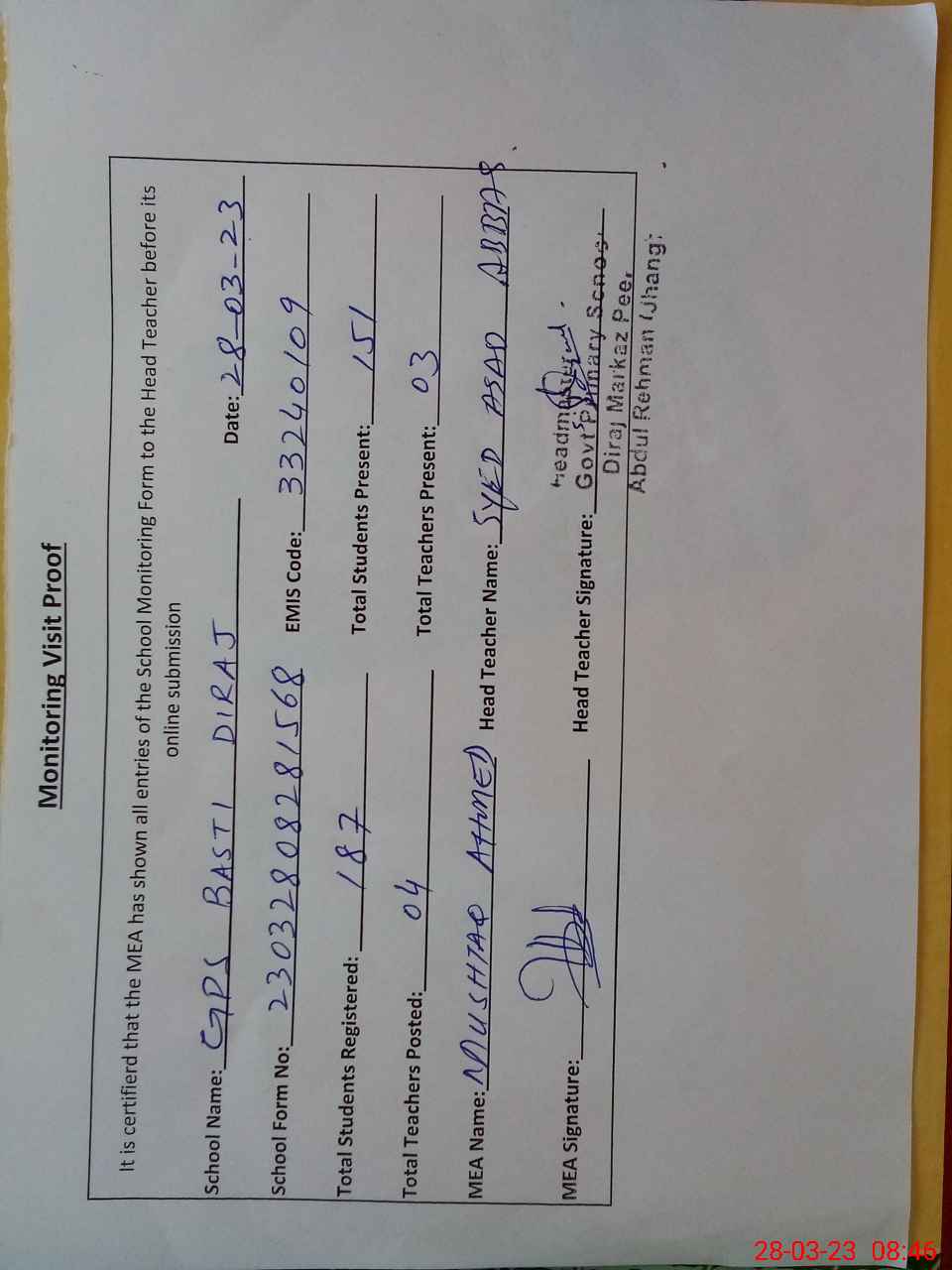 | Attendance Register | Head Teacher | MEA with School | Visit Proof |