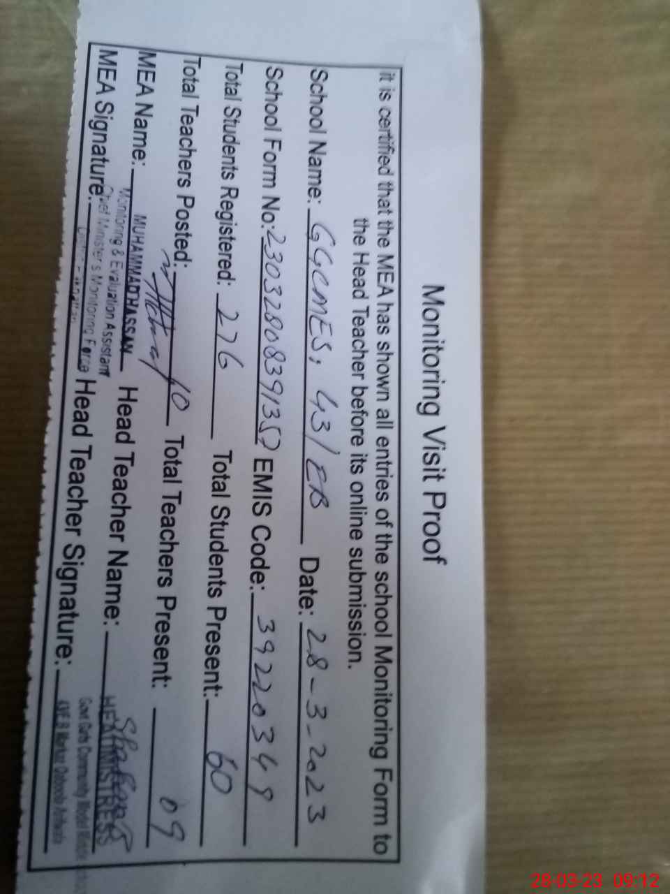 | Attendance Register | Head Teacher | MEA with School | Visit Proof |