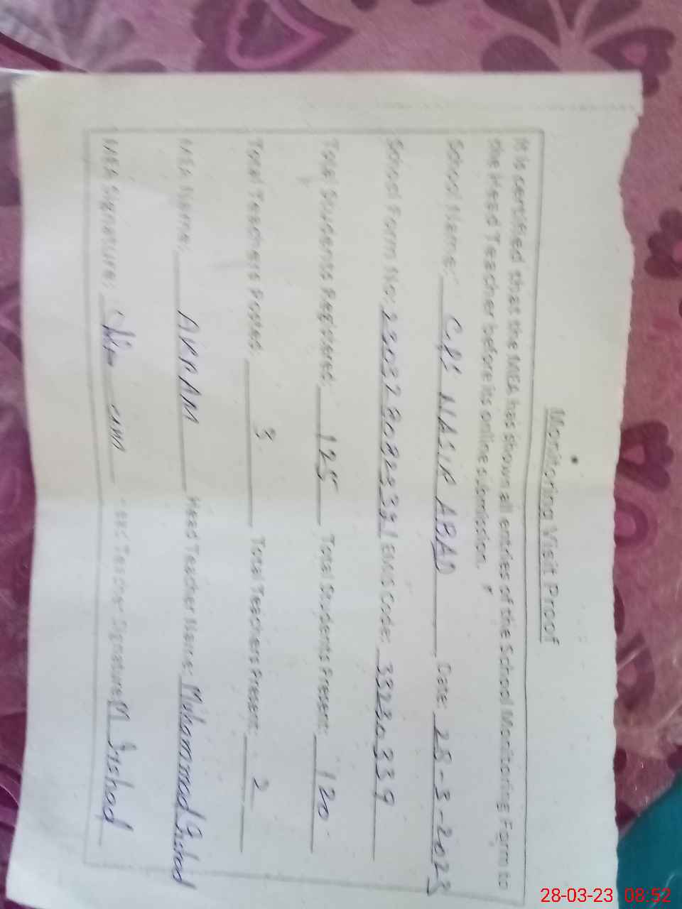 | Attendance Register | Head Teacher | MEA with School | Visit Proof |