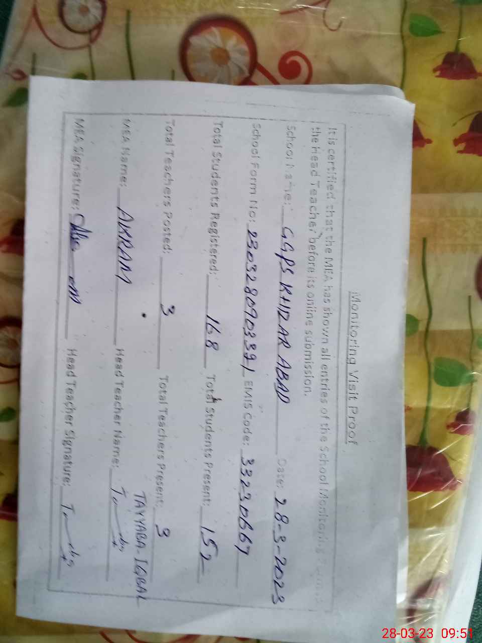 | Attendance Register | Head Teacher | MEA with School | Visit Proof |