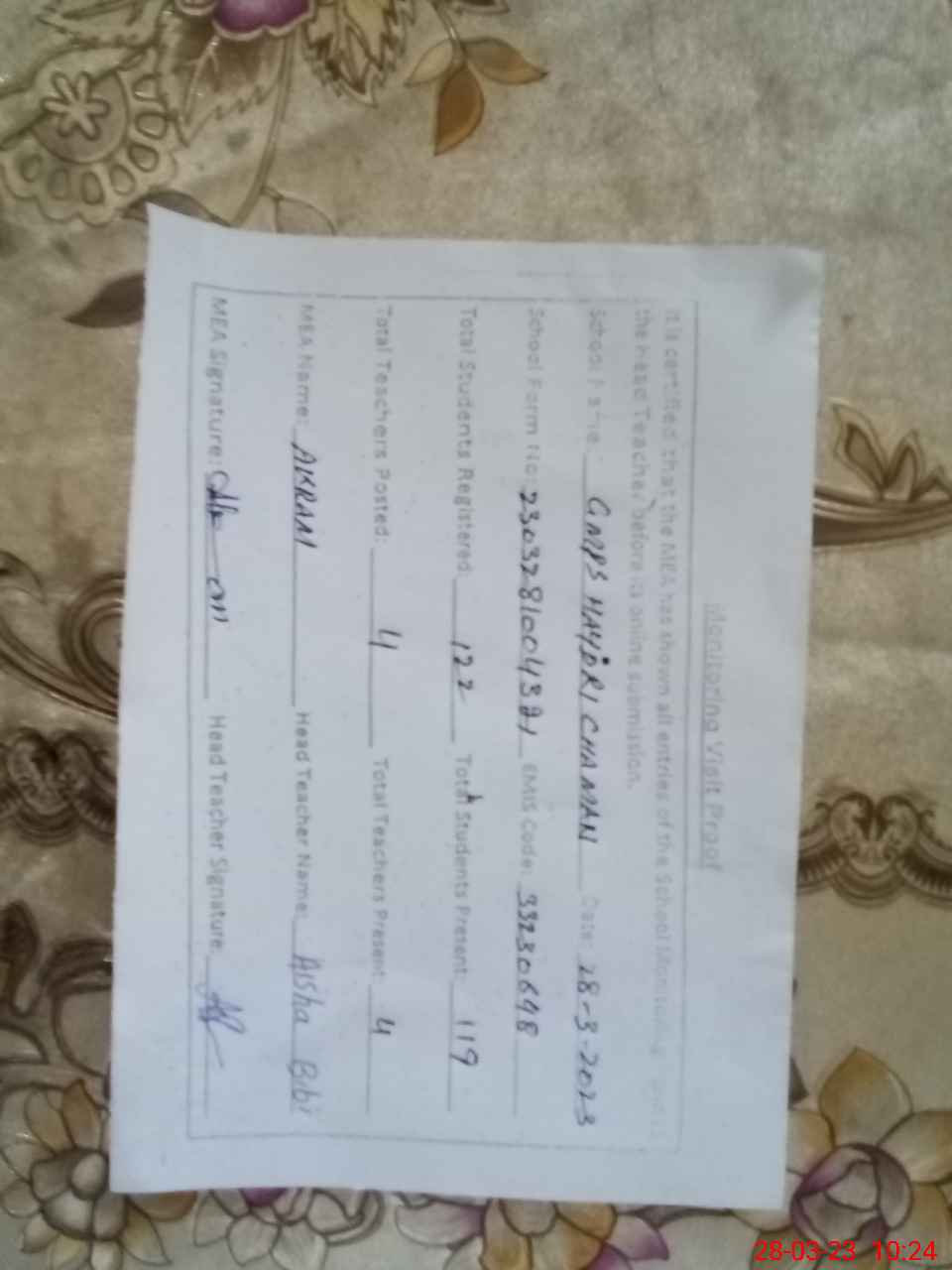 | EMIS Code: 33230648 | Name of School: GMPS HAYDRI CHAMAN | |||