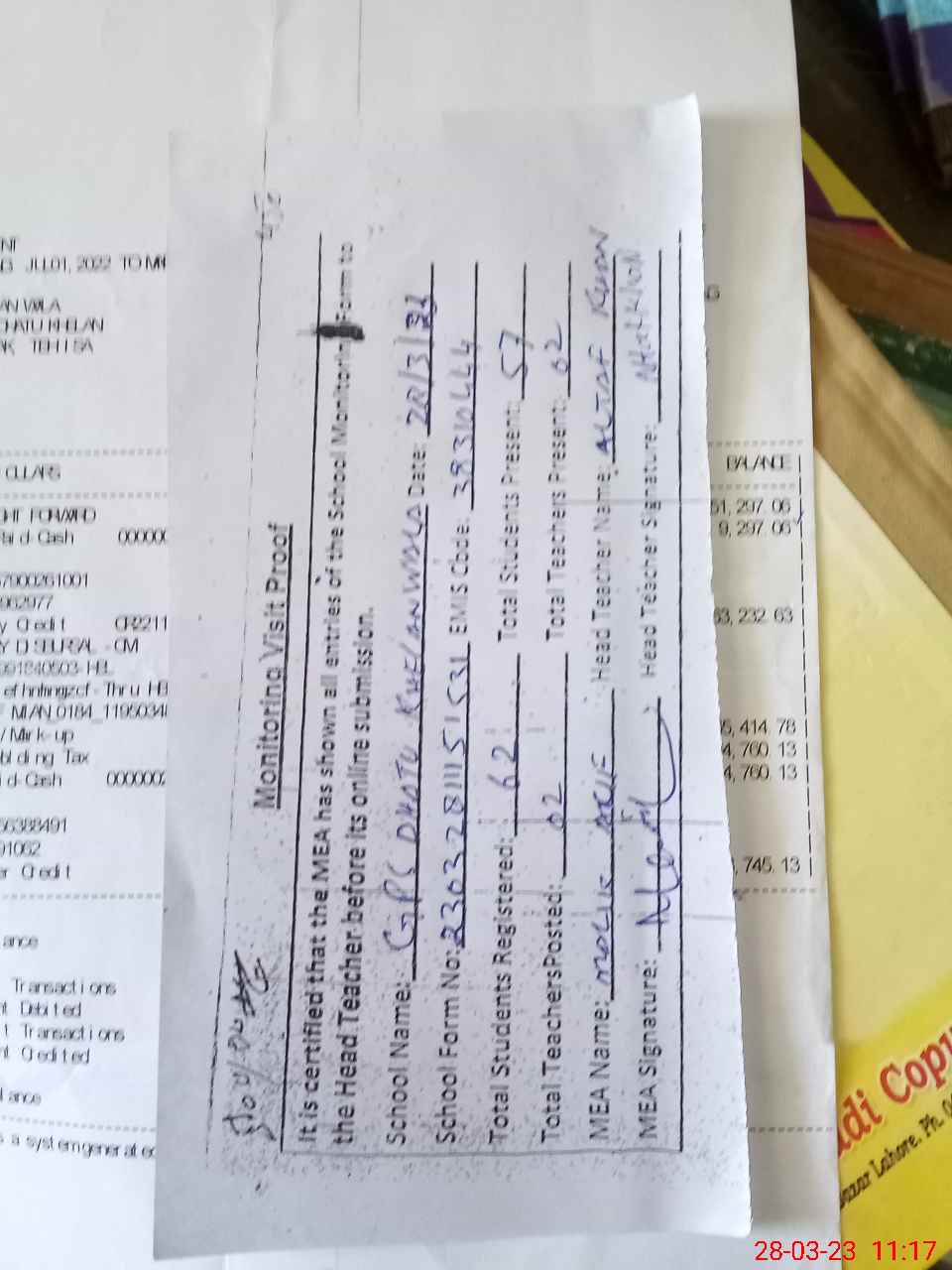 | Attendance Register | Head Teacher | MEA with School | Visit Proof |