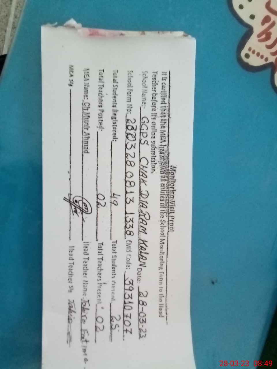 | Attendance Register | Head Teacher | MEA with School | Visit Proof |